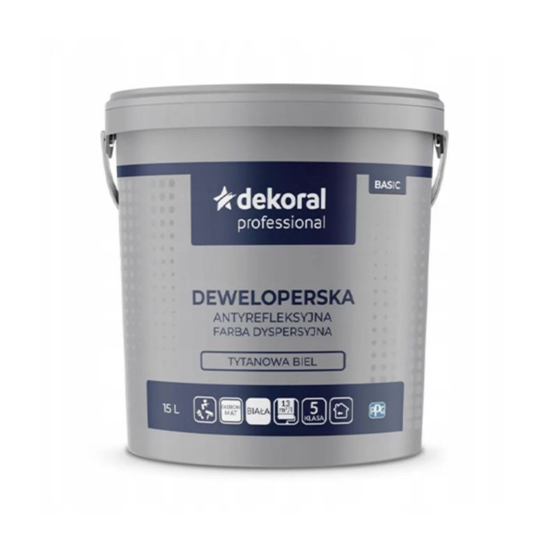 Farba Deweloperska Biały 15l to doskonałe rozwiązanie do malowania dużych powierzchni, zapewniając trwały, estetyczny i łatwy do utrzymania w czystości efekt w różnych typach wnętrz.